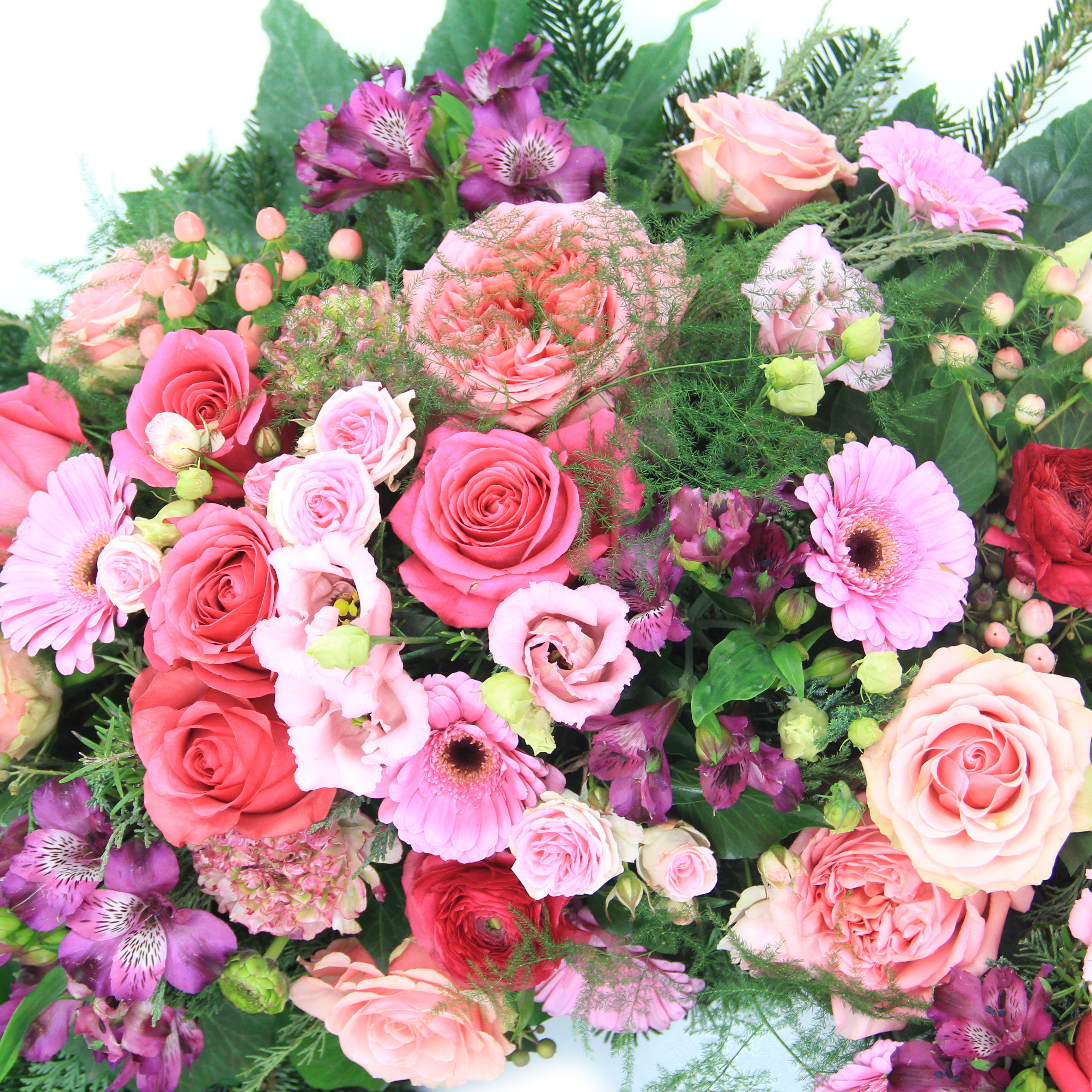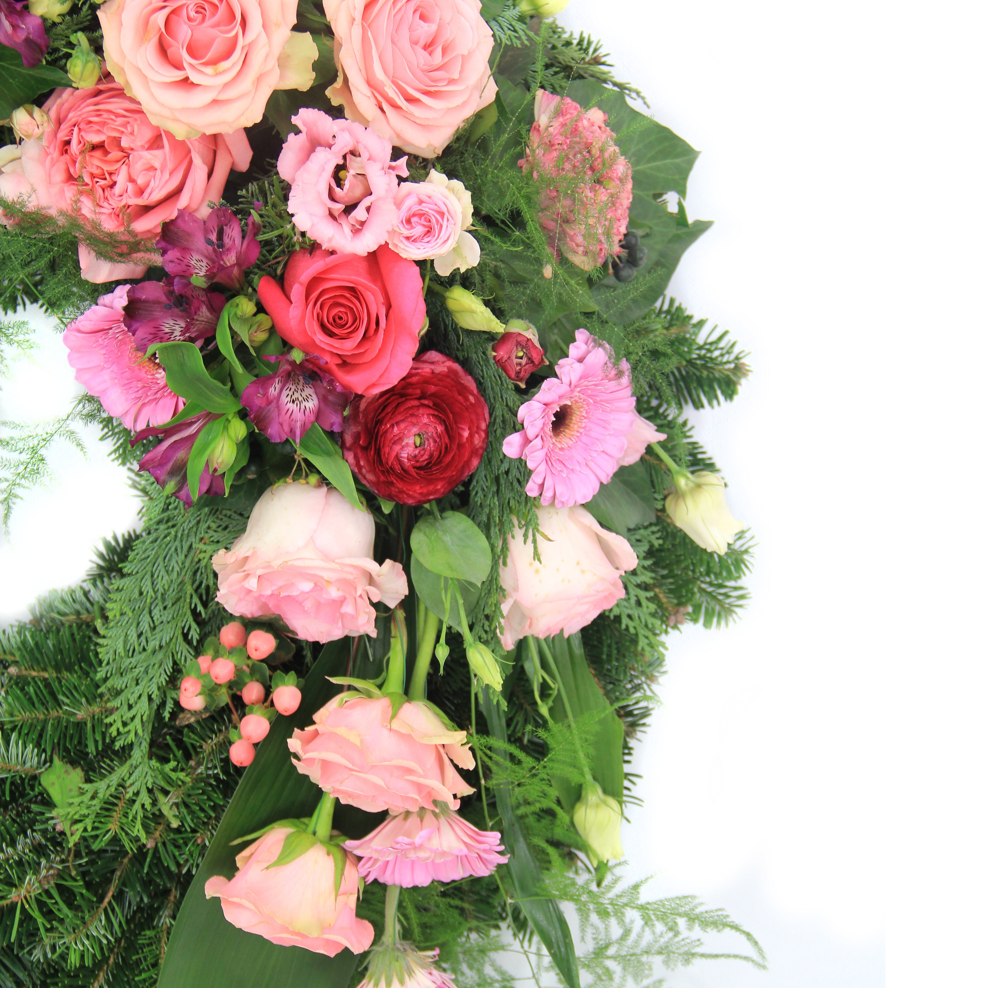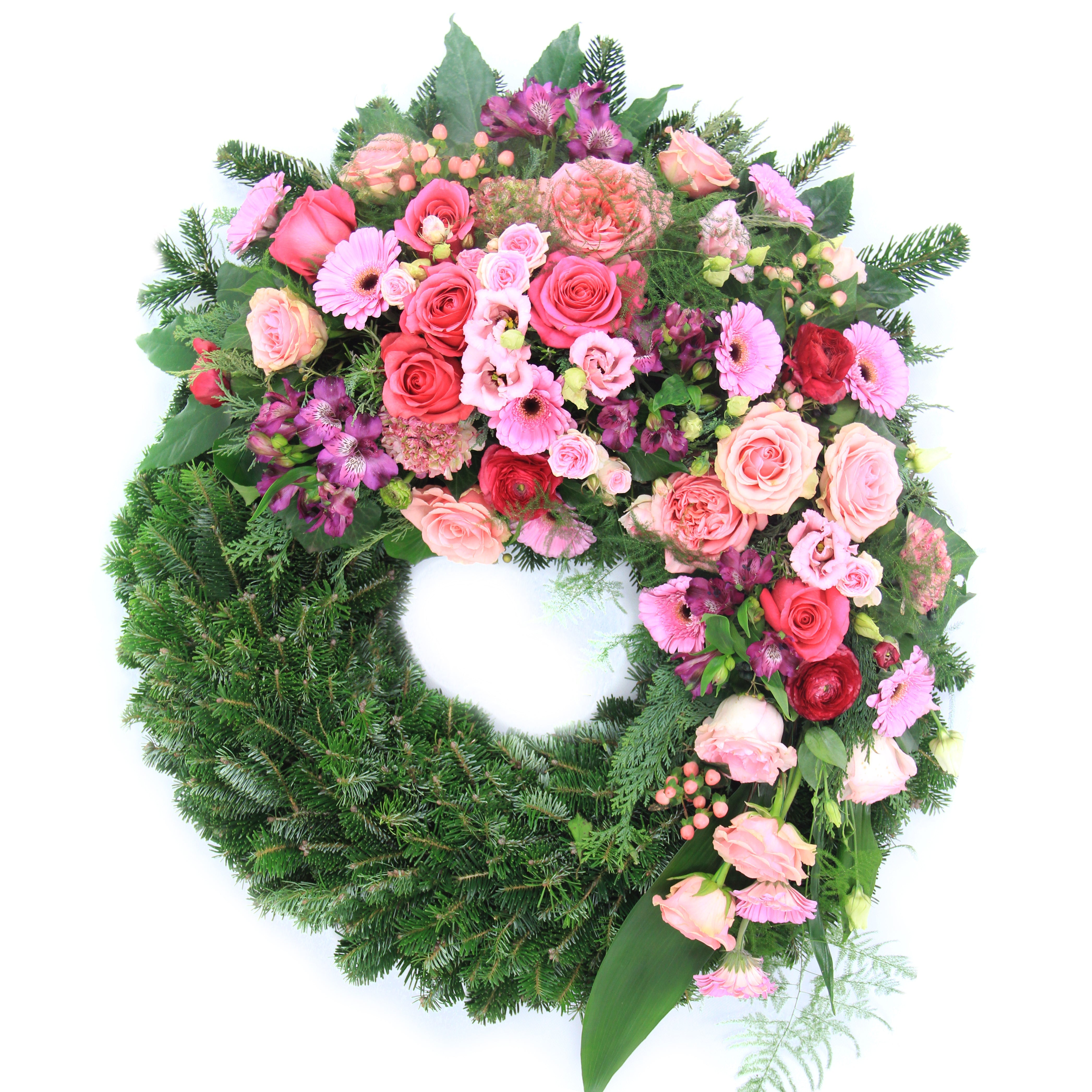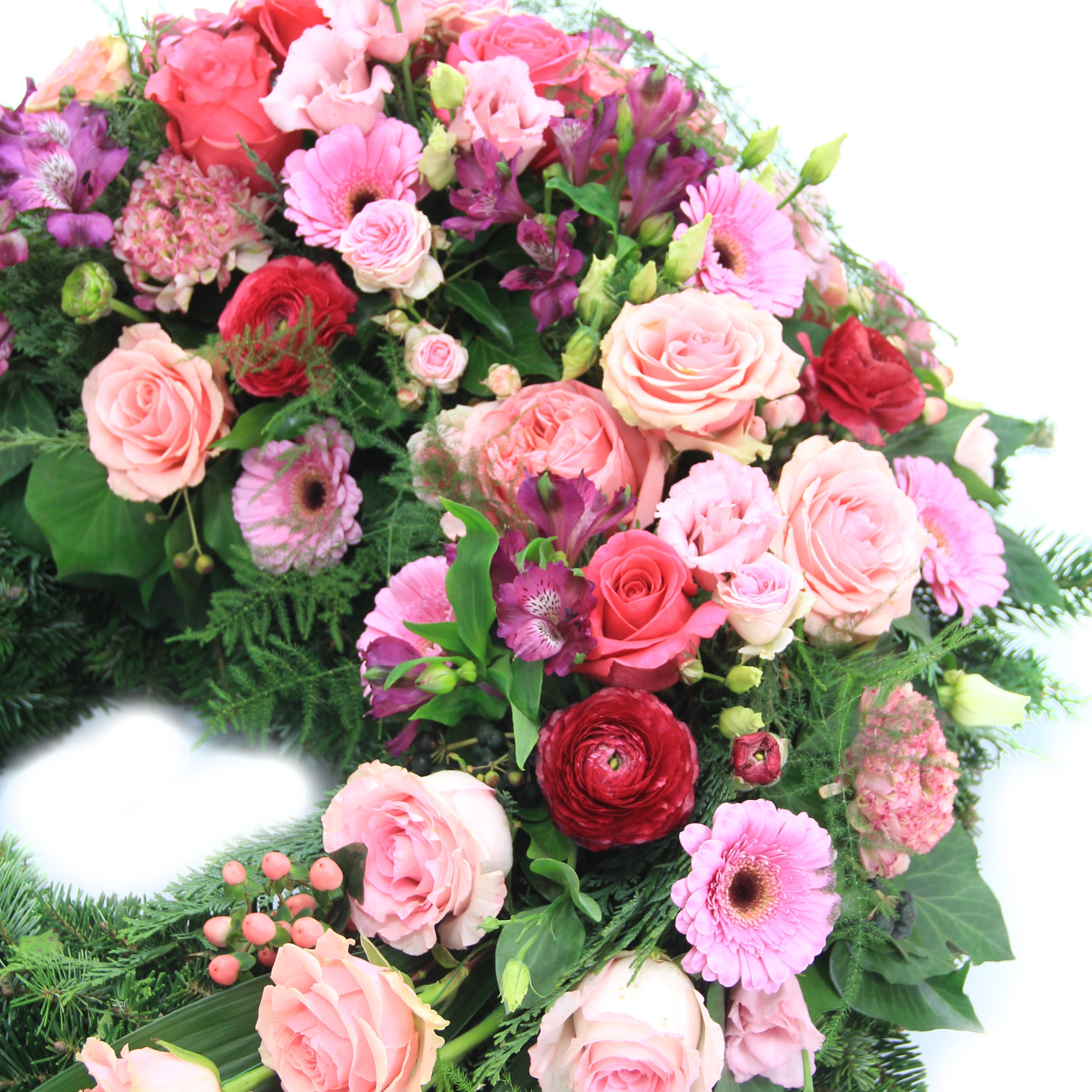 Klassische, verzweigte und Englische Rosen, Gerbera, Alstromerien (Inkalilien) und Eustoma in einem rot-rosa Farbenspiel verleihen diesem Kranz eine besonders hochwertige Note. Die Abbildung zeigt Variante L