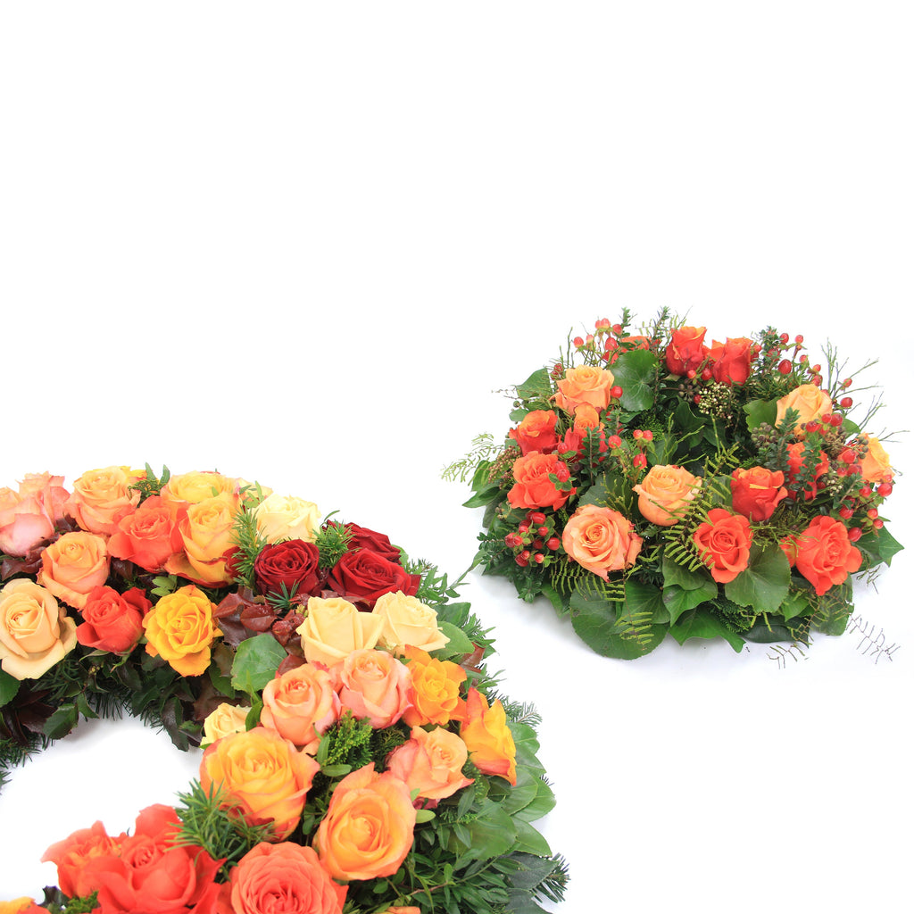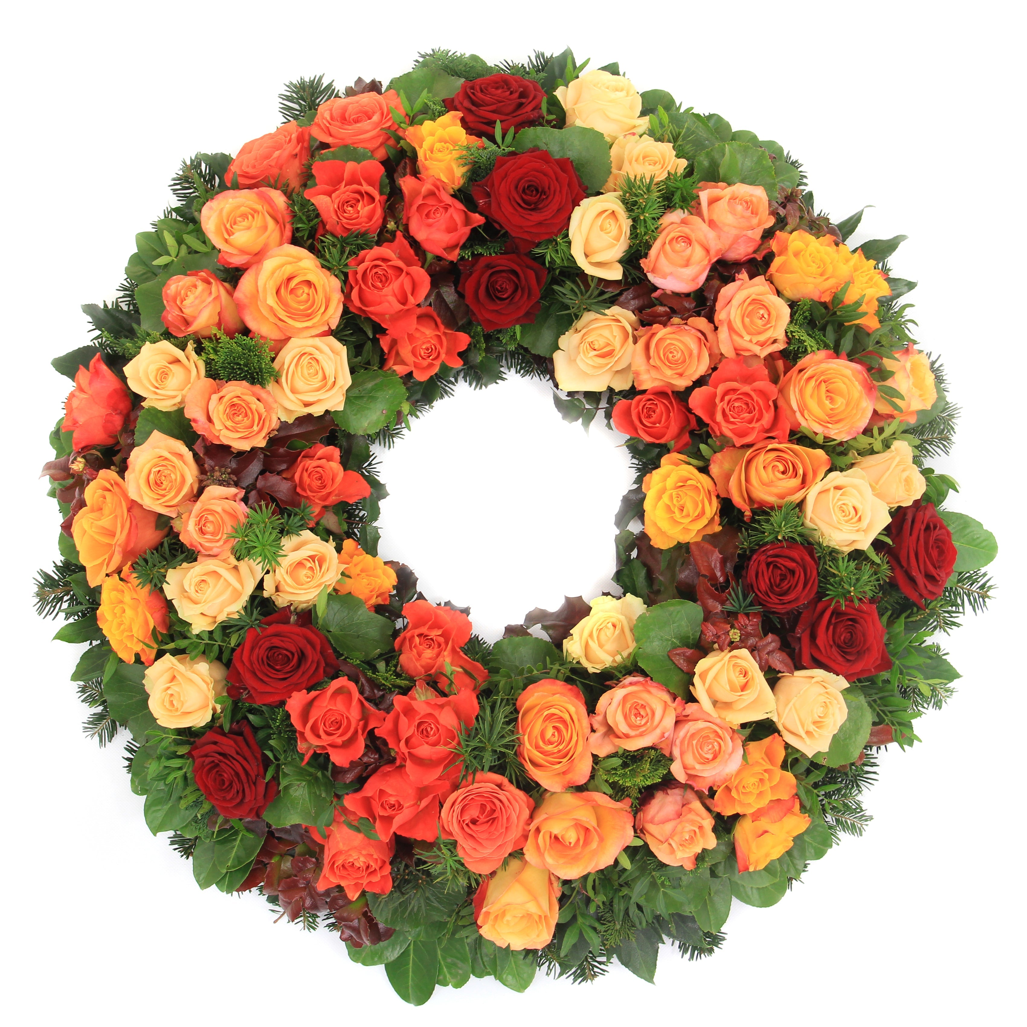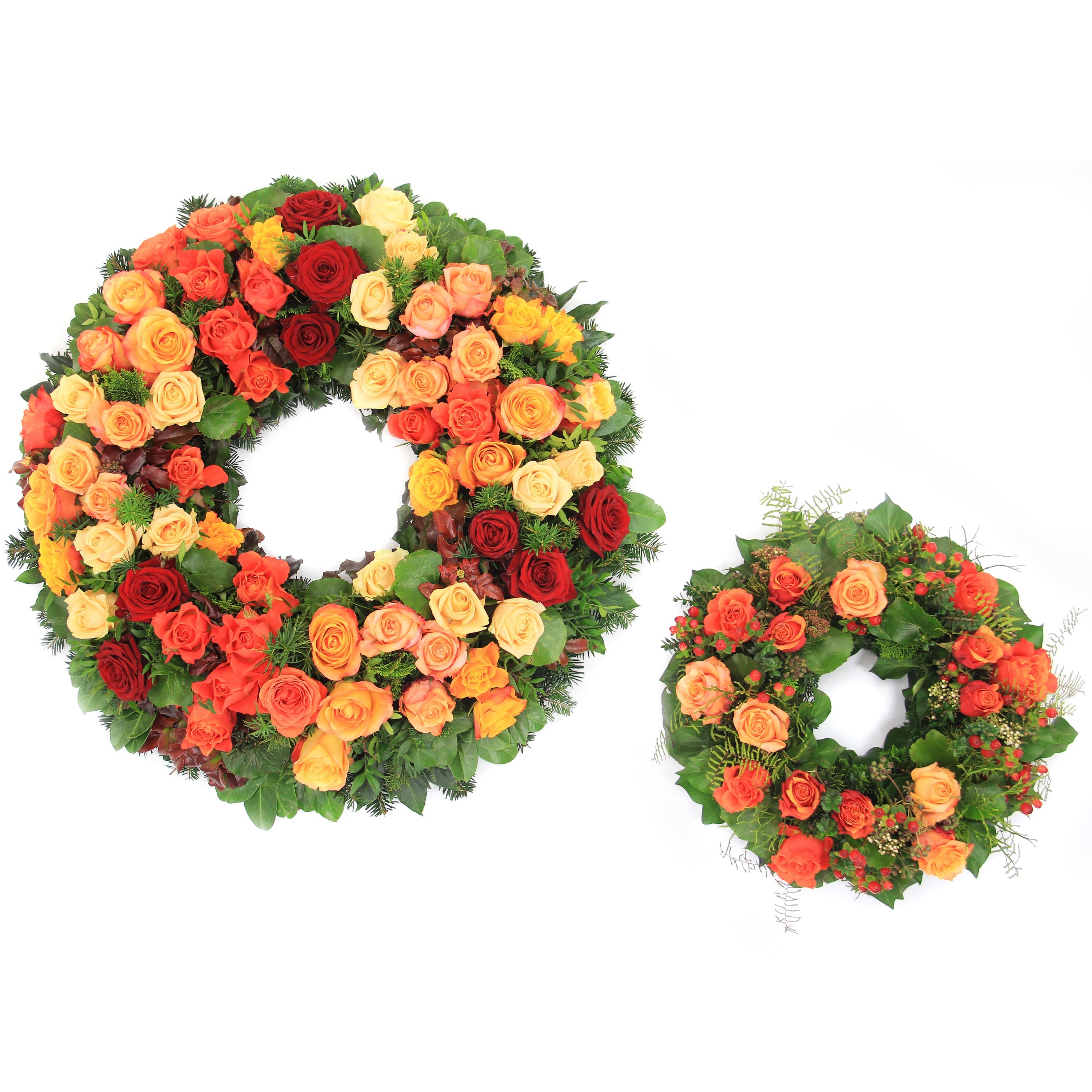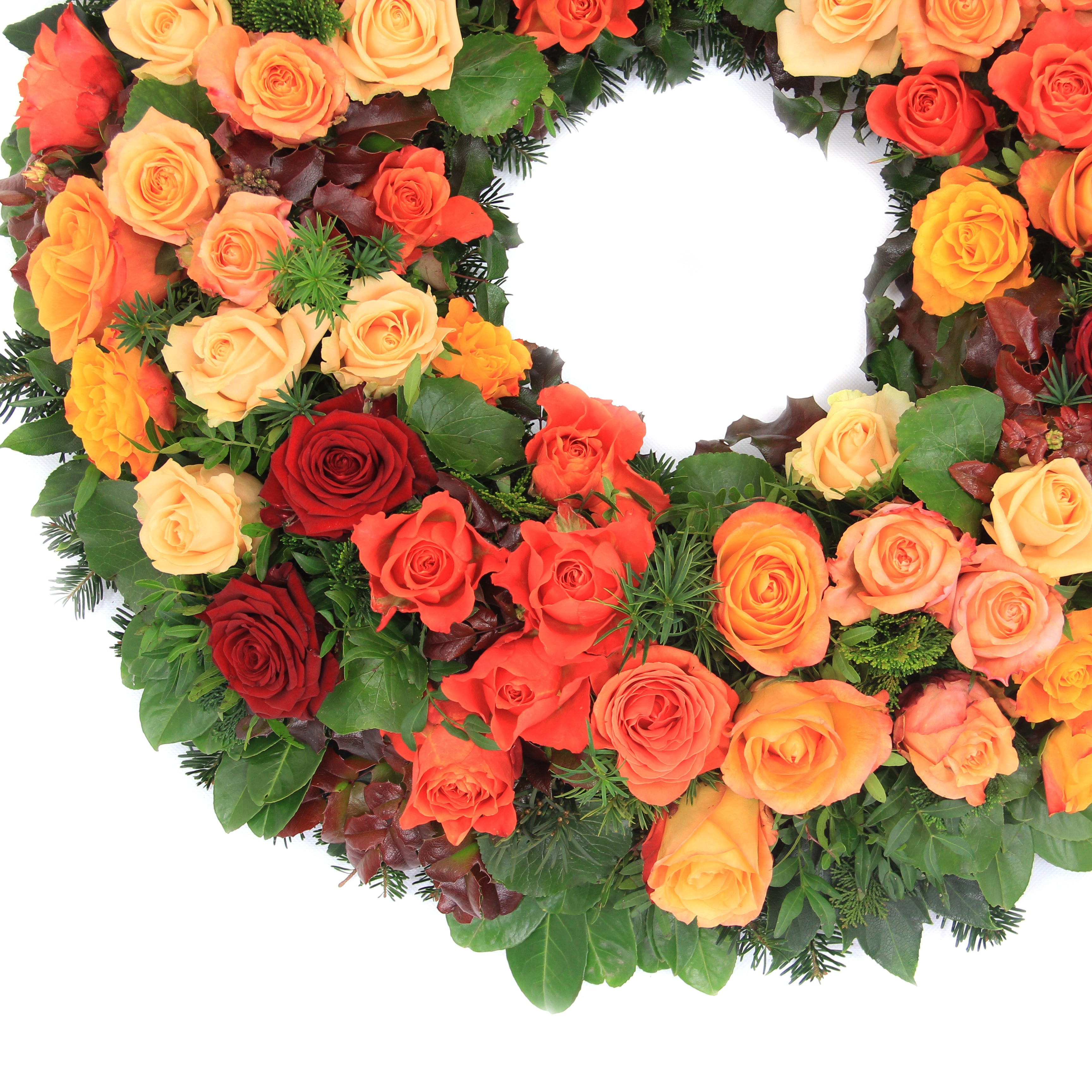 Dieser Kranz mit seinen wunderbaren Lachs-, Apricot-, Orange- und Rot-Tönen strahlt eine besondere Wärme aus und erinnert an den warmen Schein eines Kaminfeuers. Der kleine Urnenkranz ist nicht im Preis inbegriffen. Die Abbildung zeigt Variante M