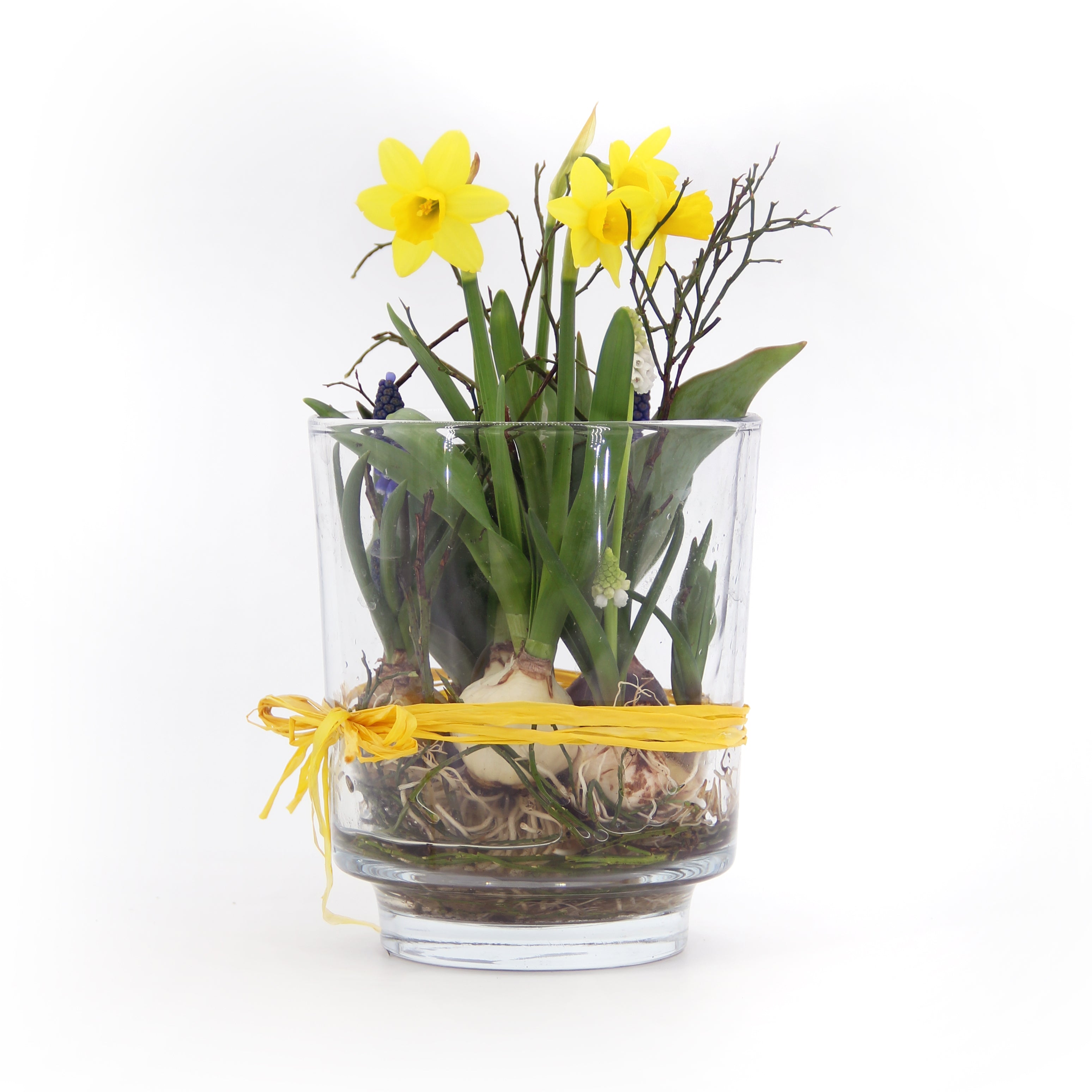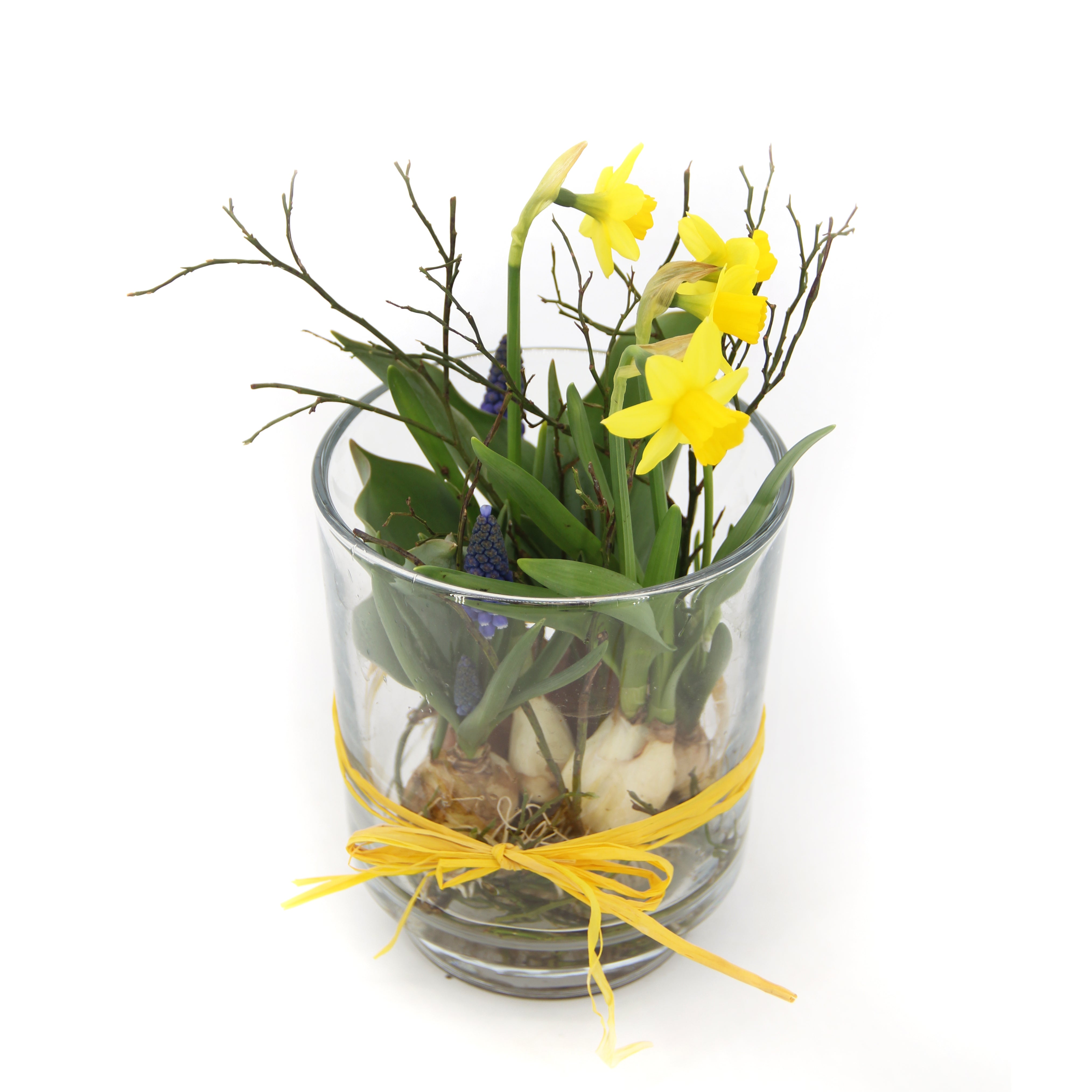 Mini-Narzissen und Traubenhyazinthen, sehr fein in einem Glas zusammen gestellt, ein echter Frühlingsbote. Die Abbildung zeigt Variante S