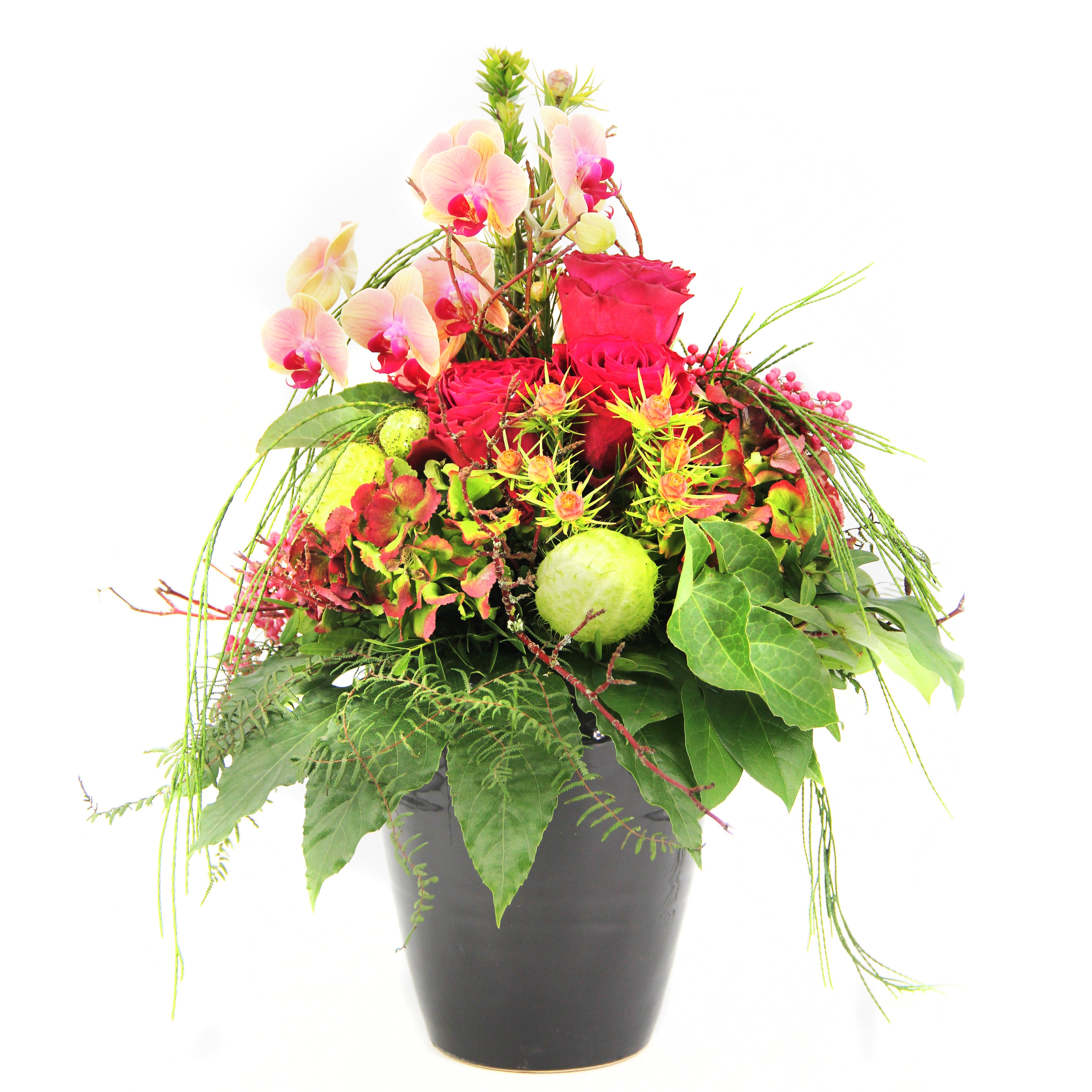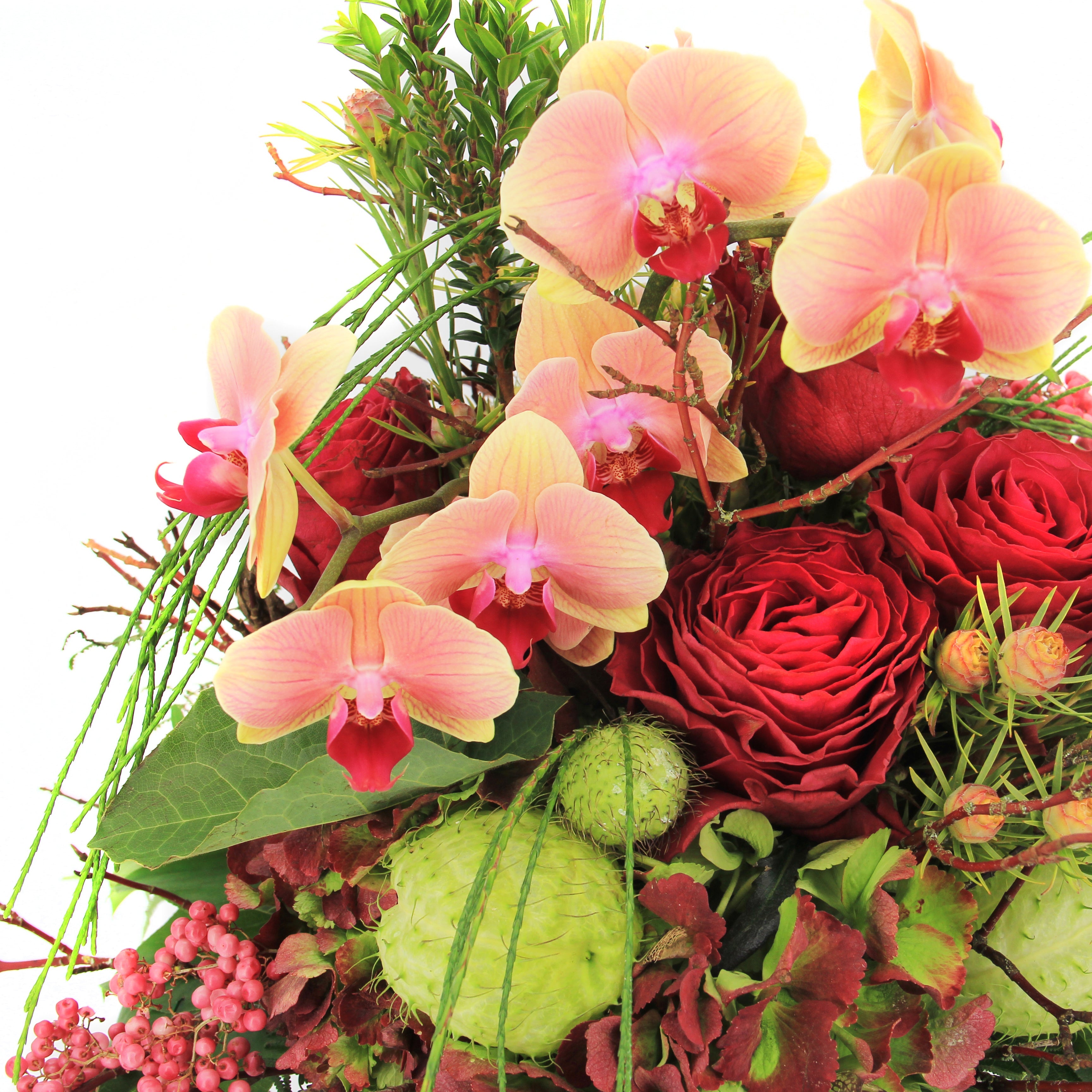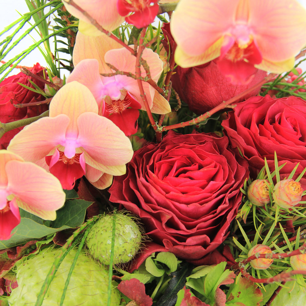Ein wahrer Augenschmaus, dieser Strauß mit lachsfarbenen Phalaenopsis-Rispen, samtroten Rosen, exotischen Ballonfrüchten und auserlesenem Grün. Die Abbildung zeigt Variante L