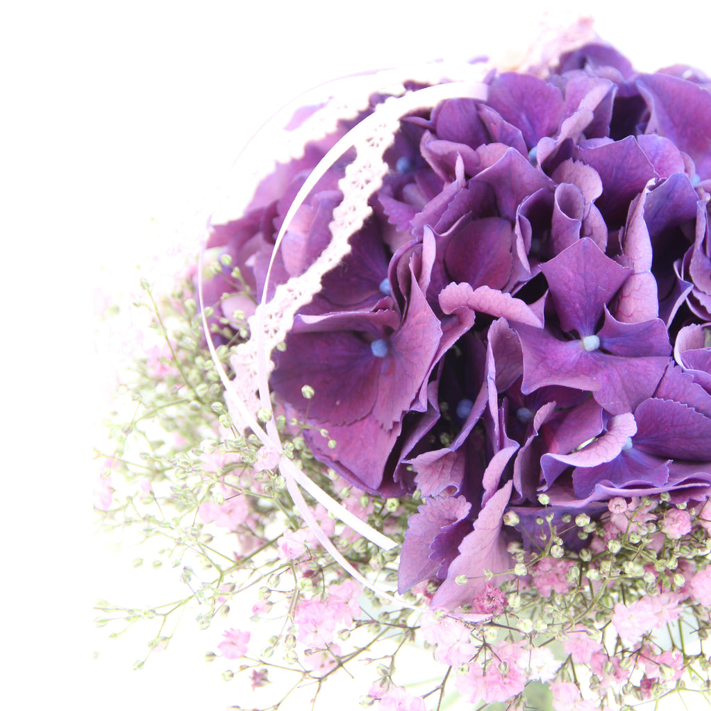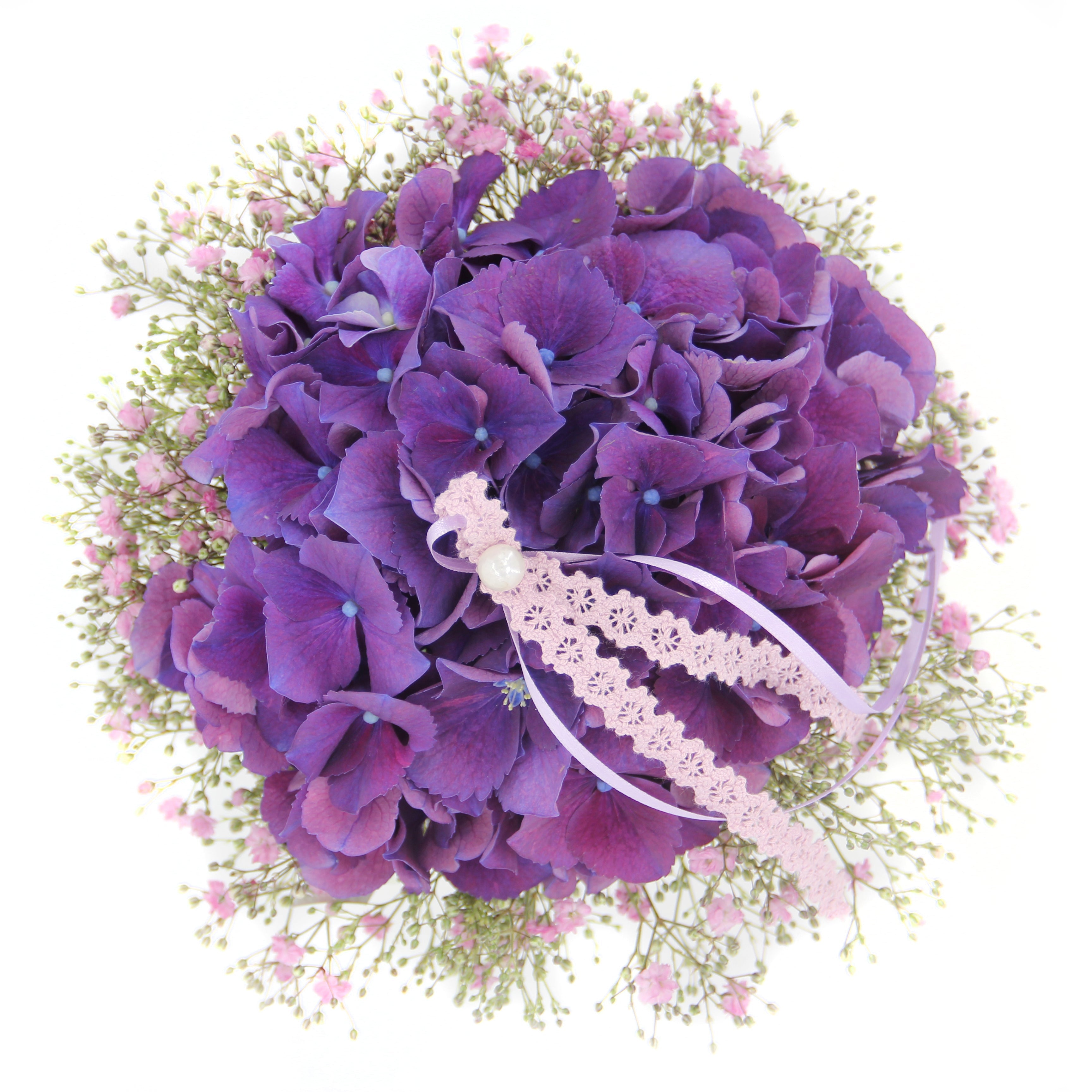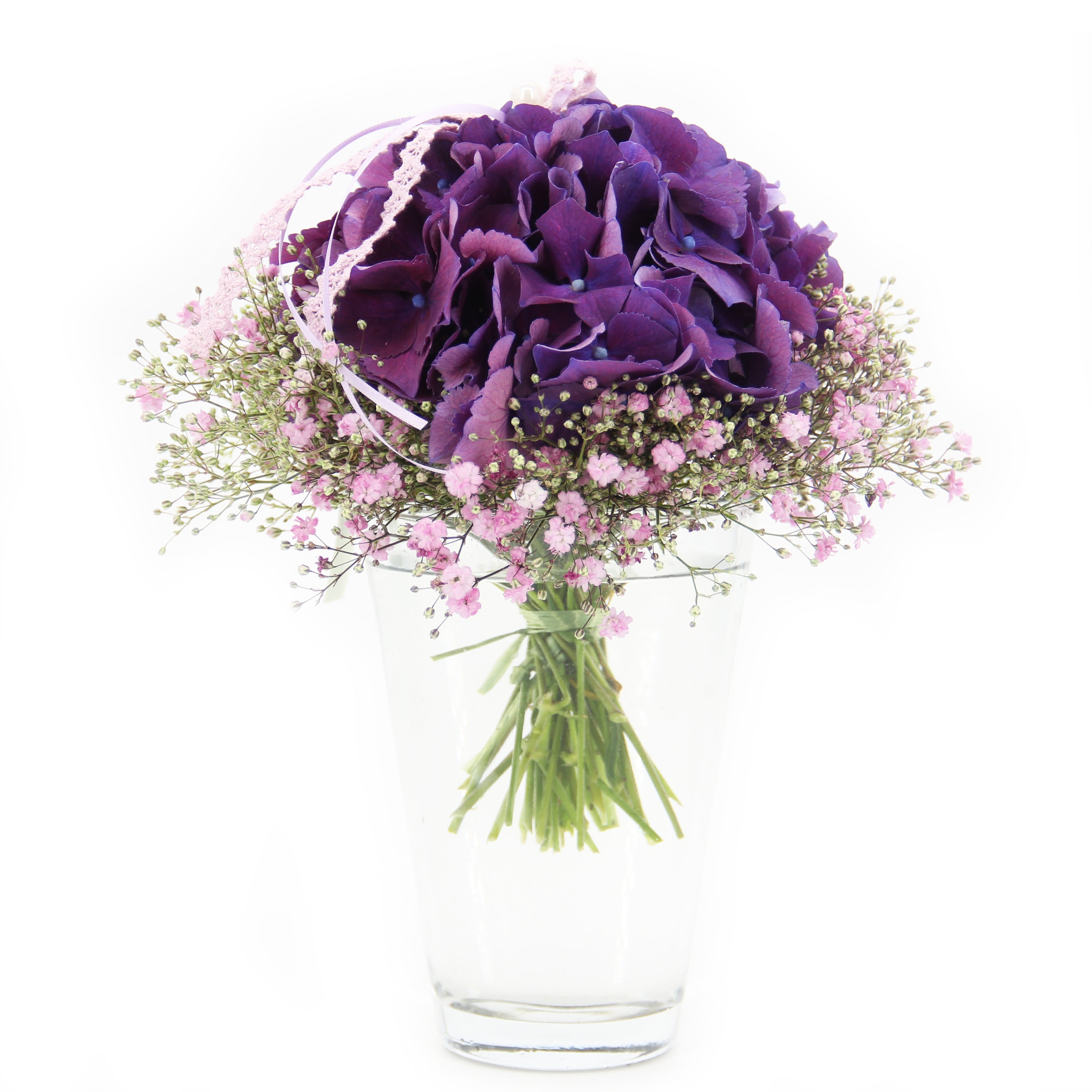 Romantik pur. Diese azurblaue Hortensie mit feinem Schleierkraut und dem sommerlichen Band lässt Träume wahr werden. Die Abbildung zeigt Variante S